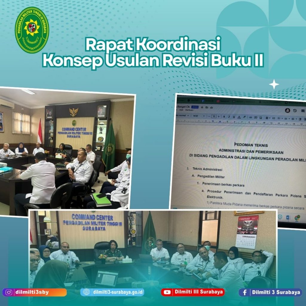Kepala Pengadilan Militer Tinggi III Surabaya Marsekal Pertama TNI Syf. Nursiana, S.H., M.H., dan Hakim Militer Tinggi Pengadilan Militer Tinggi III Surabaya serta staf Kepaniteraan mengikuti kegiatan rapat Koordinasi terkait “ Konsep Usulan Revisi Buku II “ di Ruang Tirta